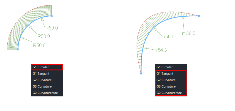 A fillet (or blend) needs to be specified differently when it is G1 Tangent or G2/G3 Curvature as the fillet will no longer have a constant radius: