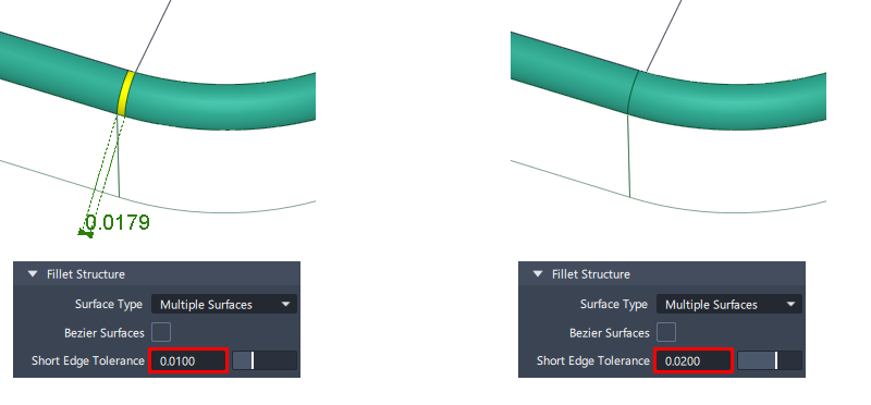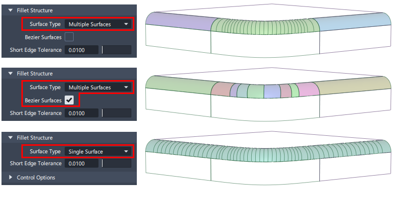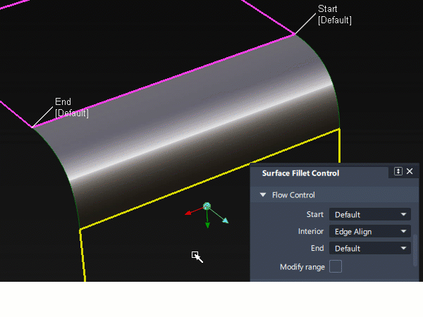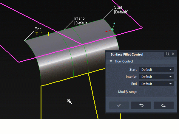 - Surface Fillet : The Start or End of the range can only be modified if the flow control option for that end was set to Default.
