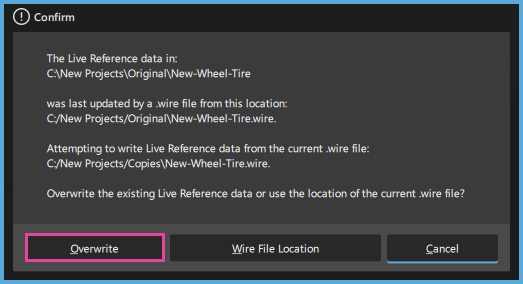 Action: You've created a new version of .wire file that was previously Live Referenced and made edits to it. You select Enable Live and choose to overwrite the existing Live Reference data.