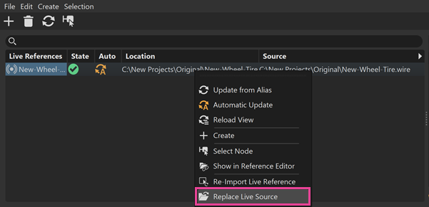 - If the .wire source files for an Alias reference have already been previously included in a Live Reference, VRED can locate the Live Reference version of the data. The Alias references load automatically.