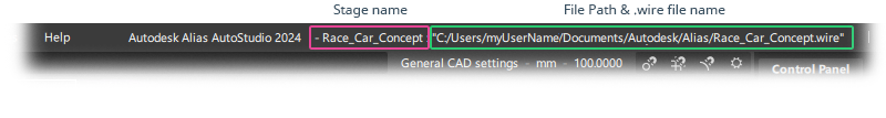 Displays the stage name or the .wire file name (and path).