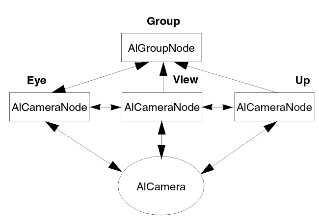 Above, we see three camera nodes and their camera object. The nodes represent the camera’s eye, view, and up positions. To create this combination, it would be necessary to instantiate and create an AlOrthographicCamera or an AlPerspectiveCamera. When they are first created, the camera nodes are siblings under an AlGroupNode.