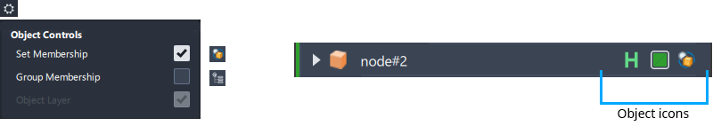 Although Group Membership is in the Object Control list, it is seen when the layer is opened to display the nodes assigned in object mode. The LMB can be used on the group icon displayed to show the full grouped object and its components. You can also select any items from this pop-up window.