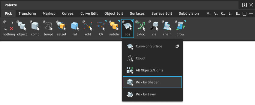 - If more than one surface is active when the Pick by Shader tool is selected, all surfaces with those shaders (in the case of more than one shader) are selected.