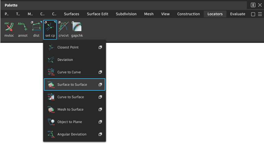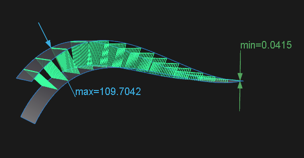 Adds a measurement showing the minimum and maximum deviation between two surfaces. This tool creates a locator showing the deviation between the two objects, labeling the minimum, maximum, and mean.