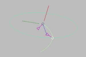 The input curve rotates in the specified plane of rotation, using the first intersection as its rotation pivot, so that it now intersects the second rail.