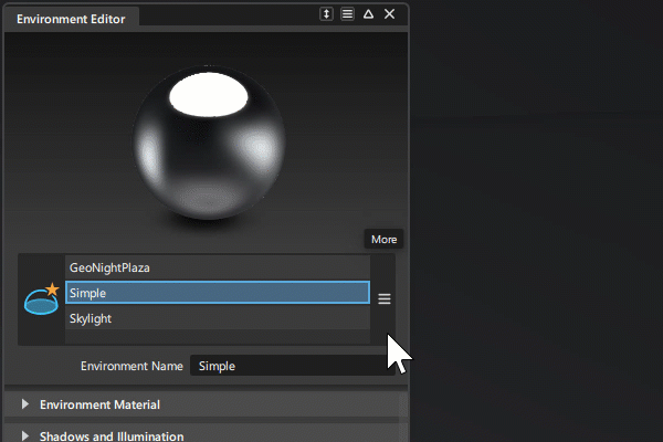 You can create one or more new environments in the scene, which allows you to quickly switch between different lighting and background setups without rebuilding the scene. This is especially useful when creating Variants or if you use Live Referencing in your workflow. Switch between your multiple environments in the Environment Editor by selecting from the environments in the list.