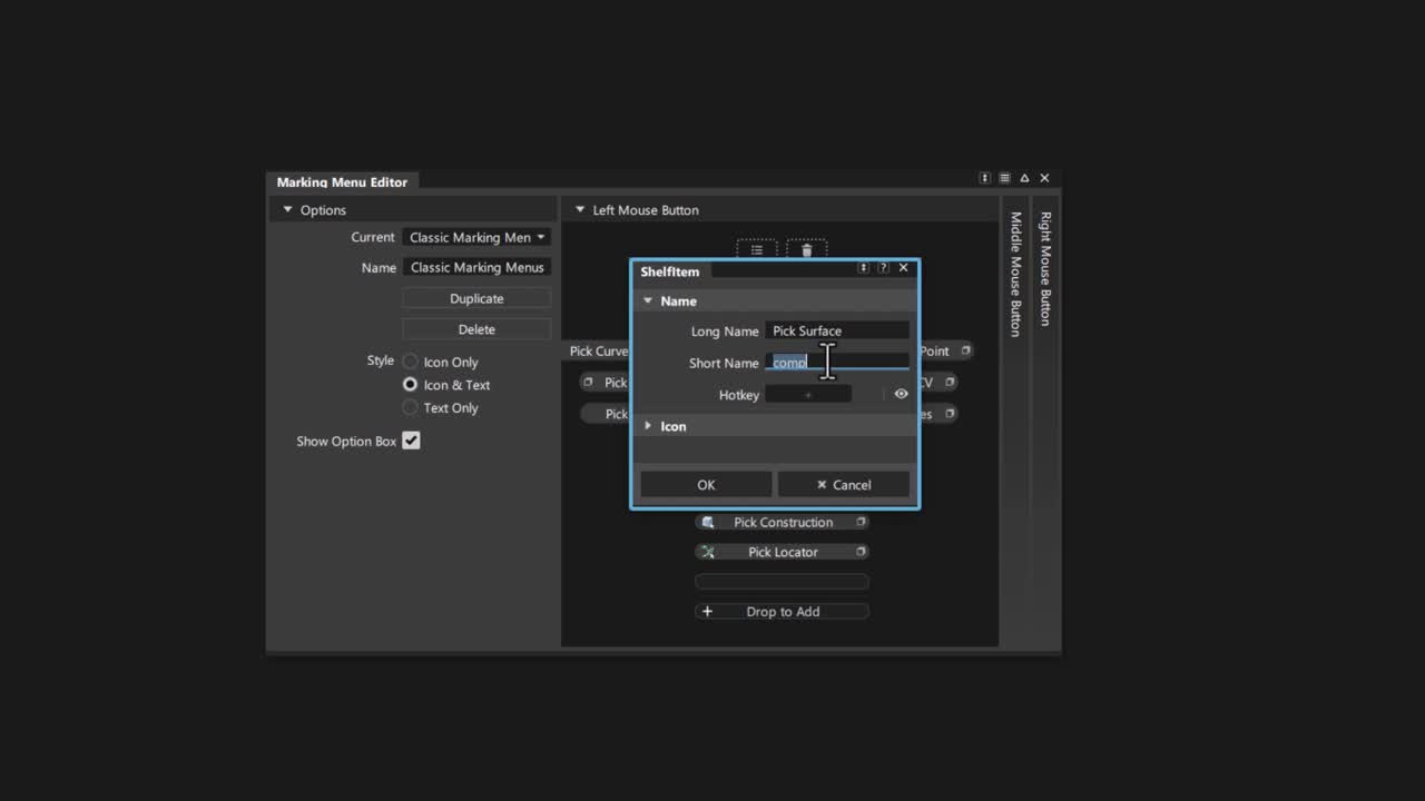 - But also, with the shelves and the marking menus, I can use this middle-mouse drag onto the edit icon and that lets me add the hotkey locally.