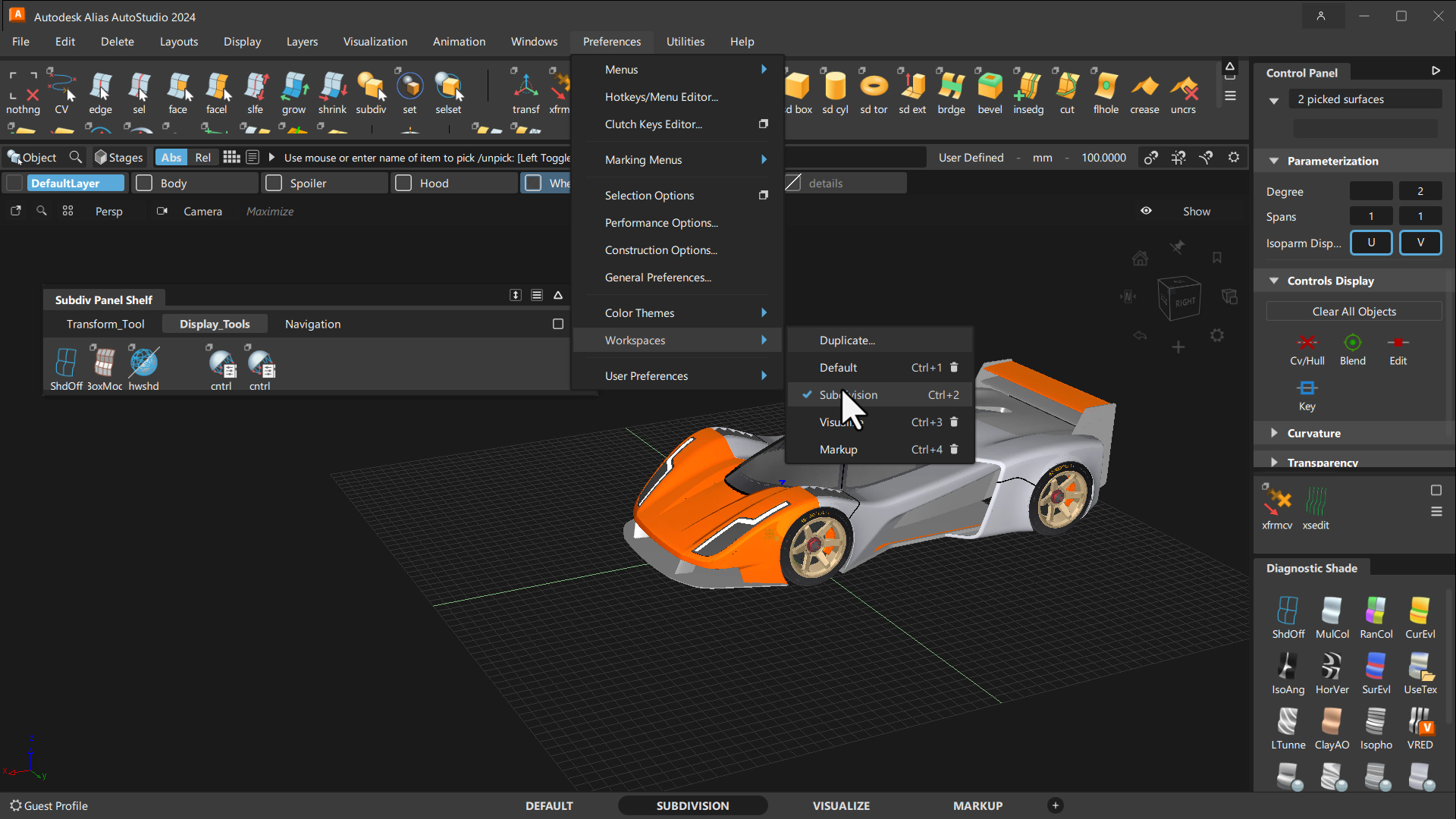 - When you launch Alias, four Workspaces are available.