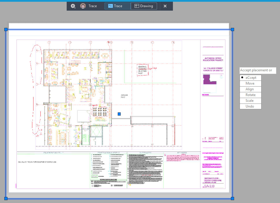 The imported file is automatically placed and aligned on top of the drawing file in a new trace. The imported file can be a representation of the entire drawing or only a part of the drawing. If the imported file is not aligned correctly, you can manually align, move, scale, or rotate the imported file.