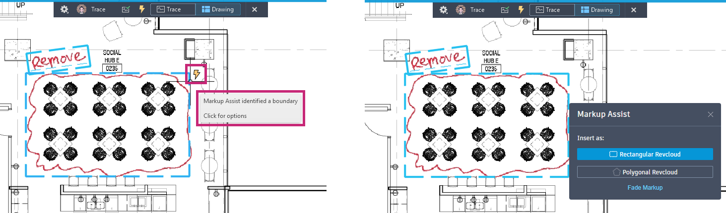 Markup Assist automatically identifies markups as text and revision clouds. After importing a markup, turn on TRACEBACK to activate the trace mode that lets you modify the drawing itself.