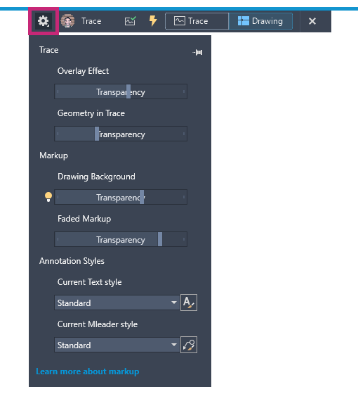 Use Fade Markup to control the transparency of individual markups. Fade Markup is useful for hiding any markups that you've already inserted, or if there is a markup you want to ignore. Access the FADEMARKUP command from the Trace toolbar, or from the Markup Assist dialog box. Control the transparency of faded markups in Trace Settings on the Trace toolbar, or with the TRACEMARKUPFADECTRL system variable.