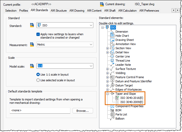 AutoCAD Mechanical continues to support the ISO 3040:2009(E) standard revision to allow documents created in previous releases to be opened, edited, and saved without updating the taper and slot symbol standard. By supporting ISO 3040:2016(E) and ISO 3040:2009(E), you can annotate new and as-built designs using the required standard revision.