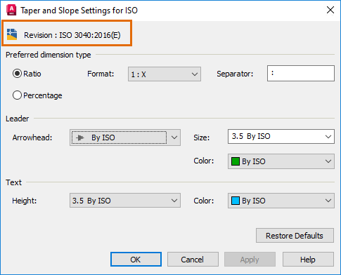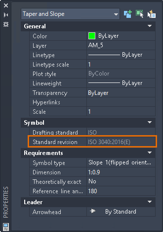 The taper and slope symbol within AutoCAD Mechanical is updated to support the ISO 3040:2016(E) standard revision. To support the ISO 3040:2016(E), all aspects of the taper and slope symbol is revised to correspond with ISO 3040:2016(E).