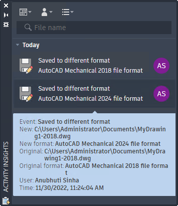 In addition to AutoCAD file formats, the Saved to Different Format event in Activity Insights supports Mechanical file formats.