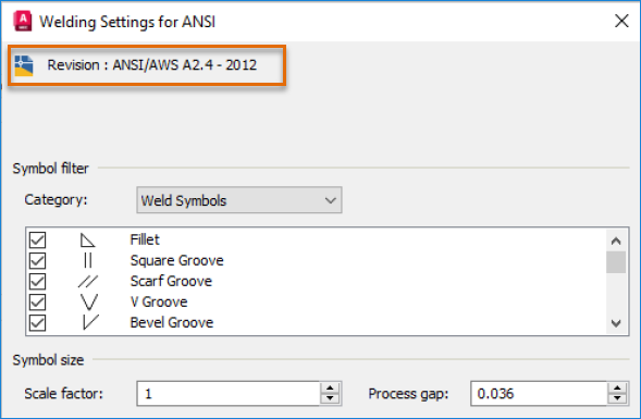 The Welding Settings dialog box displays the latest ANSI revision. The corresponding welding and backing symbols are also listed in the Symbol filter.