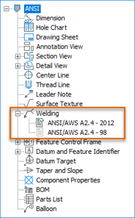 AutoCAD Mechanical toolset continues to support the AWS A2.4-1998 standard revision to allow documents created in previous releases to be opened, edited, and saved without updating the welding standard. By supporting AWS A2.4-2012 and AWS A2.4-1998, you can annotate new and as-built designs using the required standard revision.