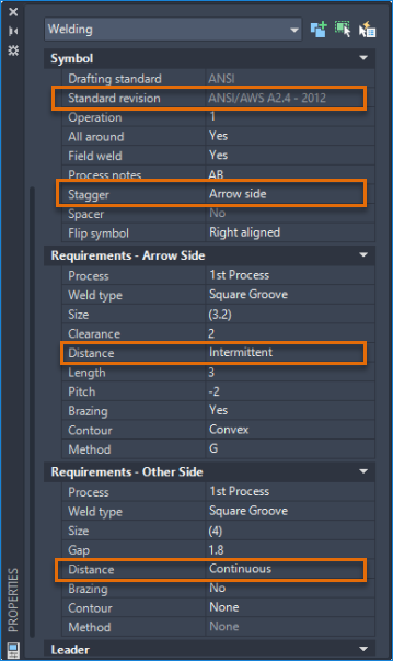 The welding symbol in AutoCAD Mechanical is updated to support the AWS A2.4-2012 standard revision. To support the AWS A2.4-2012, all aspects of the welding symbol are revised to correspond with AWS A2.4-2012.