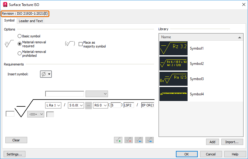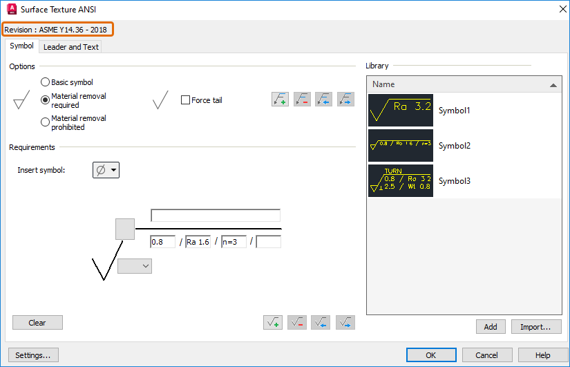 The surface texture symbol now supports the latest revisions of ISO (ISO 21920-1:2021(E)) and ANSI/ASME (ASME Y14.36 - 2018) standards.