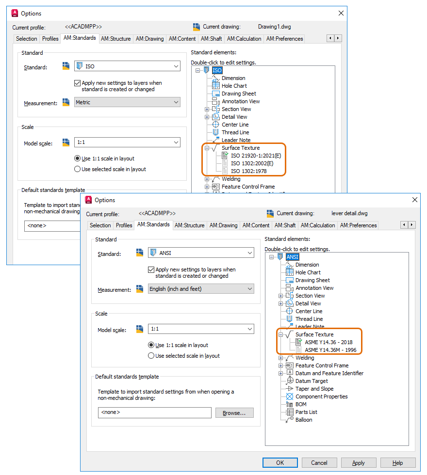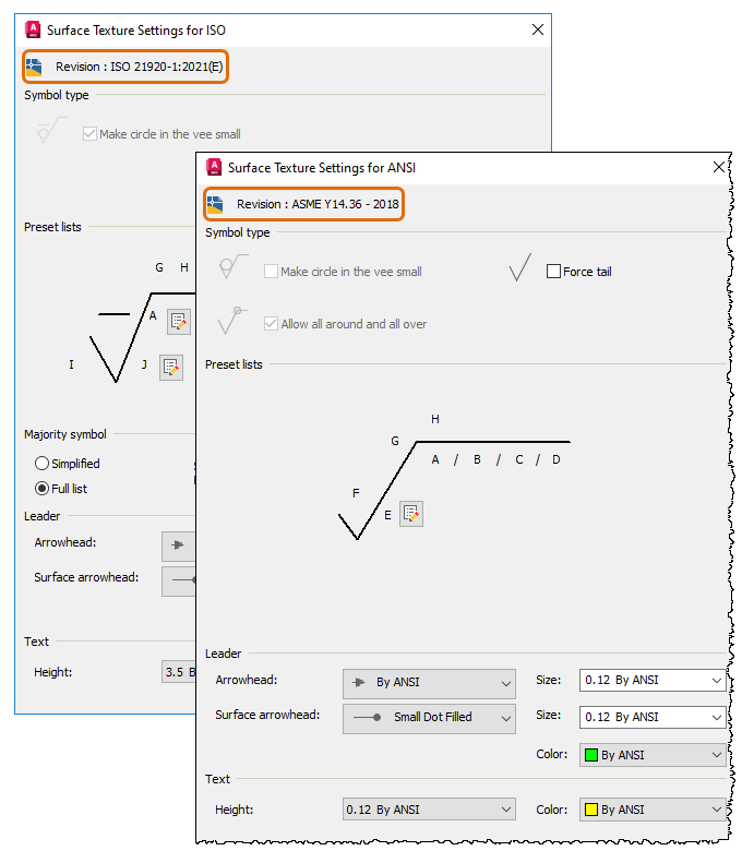 The Surface Texture Settings dialog box displays the latest ISO and ANSI/ASME revisions for surface texture symbols. The corresponding symbol type and preset list are automatically updated to reflect the most recent revision.