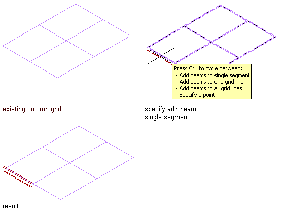 add a beam along one or more segments of a column grid (assuming Layout type is Edge) move the cursor over a segment of the grid until a preview of the beam is displayed, and then click to add a beam along that segment; or press Ctrl and click to add beams along all segments in that grid line; or press Ctrl twice and click to add beams along all segments in the grid. Press Enter to end the command.