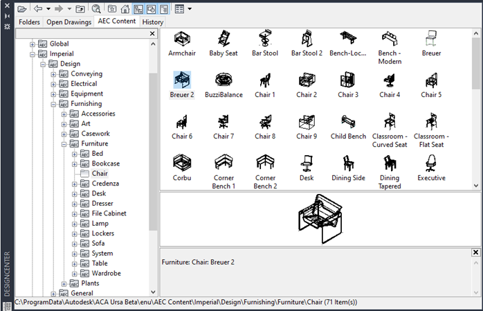 More than 200 new MVBlocks and block references are added to the AutoCAD Architecture (US Imperial) and AutoCAD Architecture (US Metric) content packs for Design Center. The added content is available in metric profile for non-English languages. The content includes external lighting, bathroom accessories, furniture, site, kitchen fittings, and more.