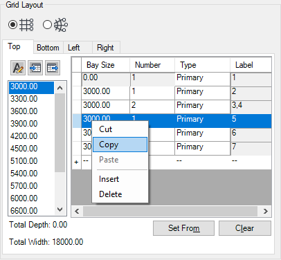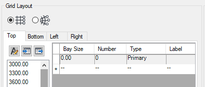 - Under Type, select if the grid line associated with the bay should be labelled as primary grid line or secondary grid line. By default, primary grid lines are chosen. Note: The Label column is a read-only column showing you the grid label for the associated grid line. You can change the labeling of the grid under Bubble Parameters below.