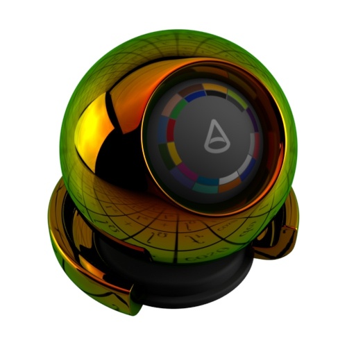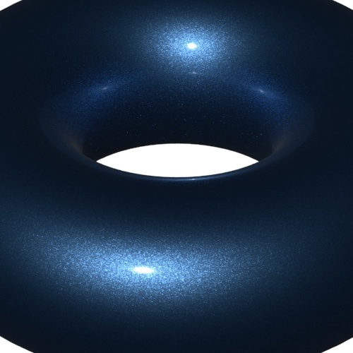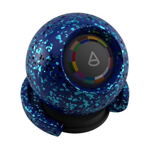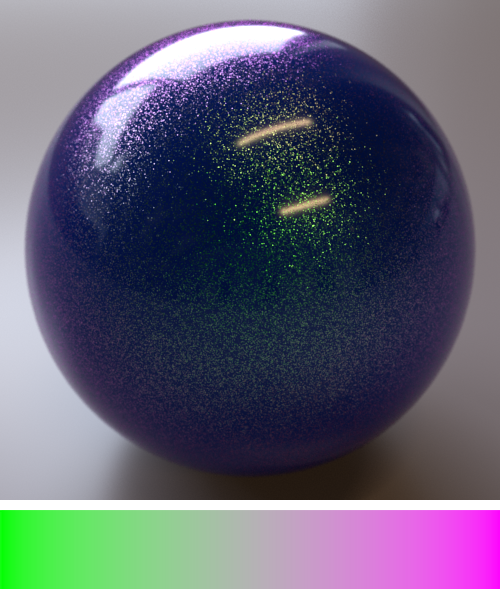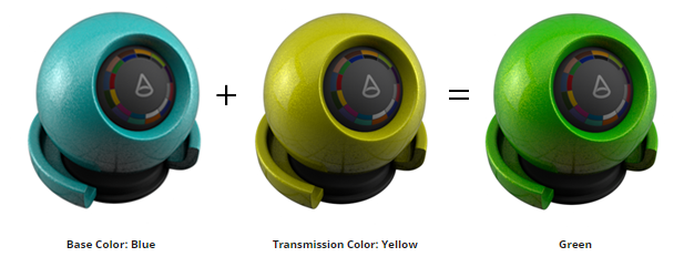 The Transmission Color also affects the appearance of the flakes. For example, when the Base Color is blue and the Transmission Color is yellow it becomes multiplied and renders as green, with the flakes tinted yellow.