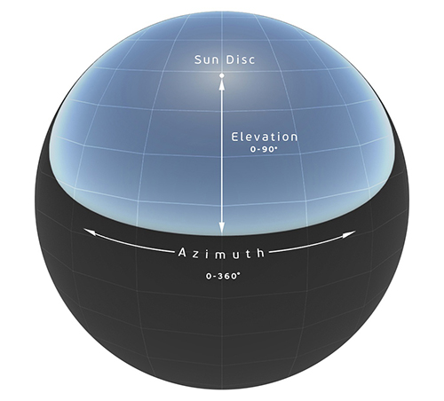 The Physical Sky uses a polar coordinate system. Elevation has an angle between 0 degrees to 180 degrees (sunrise to sunset). The sun is at the zenith at 90 degrees. The azimuth has an angle between 0 degrees to 360 degrees.