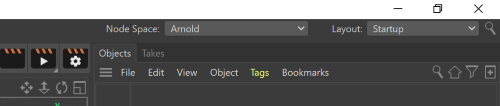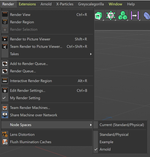 Before creating a new Node Material, make sure that the active Node Space is Arnold. If you select Arnold as the active renderer in the Render Settings, the Node Space is automatically set. Otherwise, you can set the Node Space on the application toolbar (Cinema 4D R24) or from the Render > Node Spaces menu.