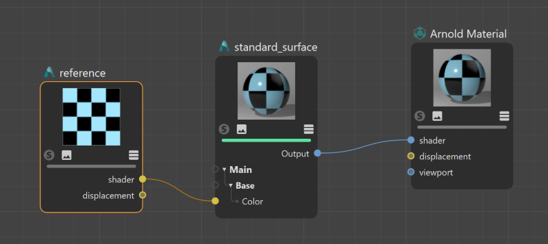 The reference shader allows you to include another material, either a Node Material or an old Arnold Material within the graph. For instance, you can create a procedural texture and reference it in multiple materials to drive different parameters. Modifying the referenced material will update all parent materials.