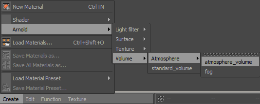 Atmophere shaders can be found can be found under Create > Arnold > Volume > Atmosphere in the Material Manager.
