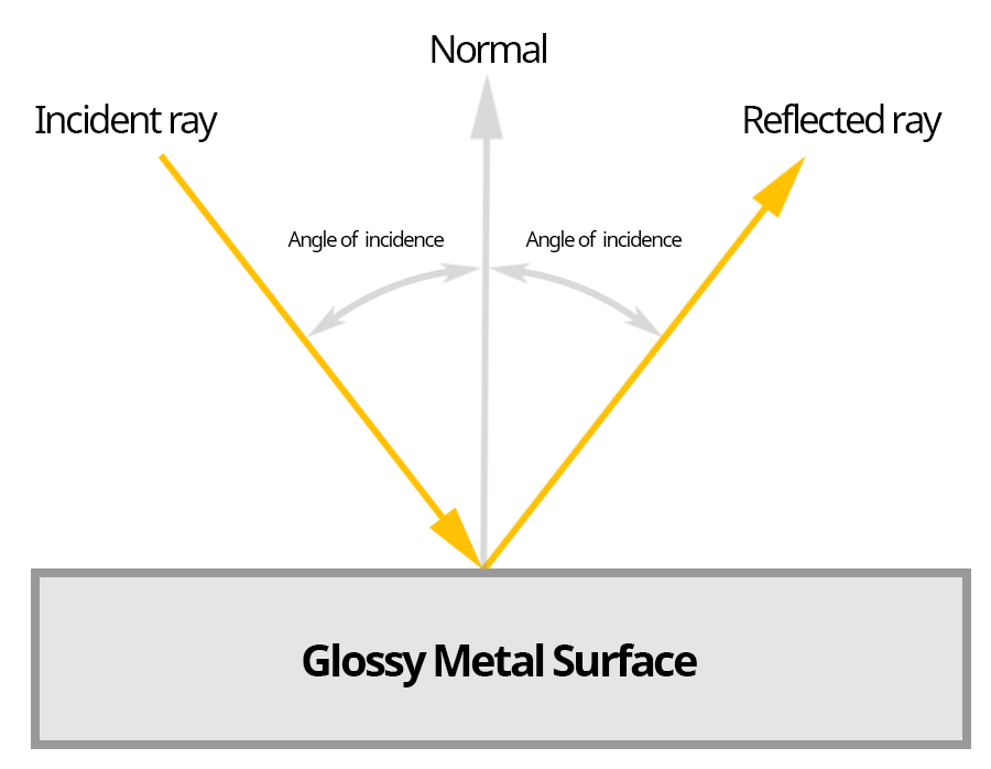 The light ray that hits a surface is called the Incident Ray and the angle that at which it hits is called the Angle of Incidence (as shown in the figure below). Light energy reflected back must be less than or equal to light incoming to a surface (we cannot "add" light). On the surface, the ray is either reflected or refracted, and it can eventually be absorbed by either medium.
