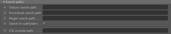 These settings specify the search paths used by C4DtoA to find textures, procedurals (e.g. ASS files ) and plugins (e.g. third-party shaders).