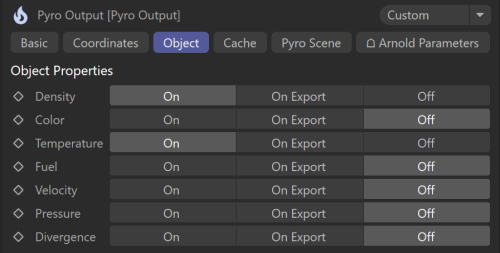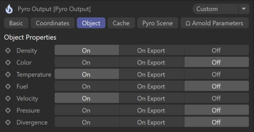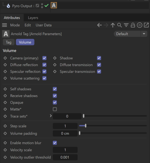 Arnold specific settings can be edited via an Arnold tag assigned to the Pyro object.
