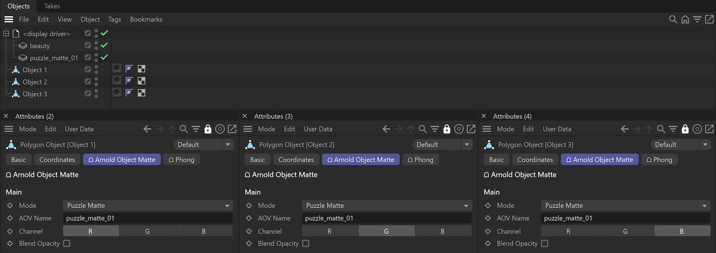 Follow these steps to setup a Puzzle Matte AOV for object IDs.