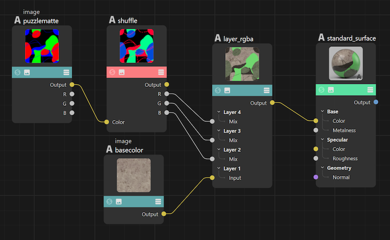 Puzzle mattes are mainly used in compositing, but they can also be useful in texturing. Since they can hold up to 3 masks, you can use a single puzzle matte to mix multiple color/texture layers together.