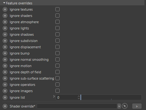 This group of switches allows you to disable a number of important rendering features. By selectively disabling some features, you can get a feel for where the renderer is spending most of the time, which helps optimizing scenes. Lighting or look-dev could be sped up by enabling Ignore Textures or Ignore Shaders for example. This is also useful for isolating errors and artifacts when debugging. Note that not all of these options are interactive - some of them may require the entire scene to be refreshed/exported.