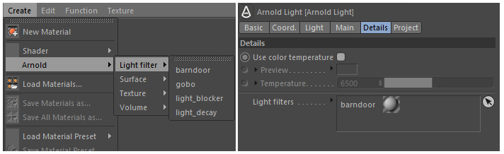 Since light filters are shaders, to add a new light filter, you have to create a new Arnold Material. Go to the Material Manager and select Create > Arnold > Light filter from the menu. Then drag and drop the material to the light filter list.