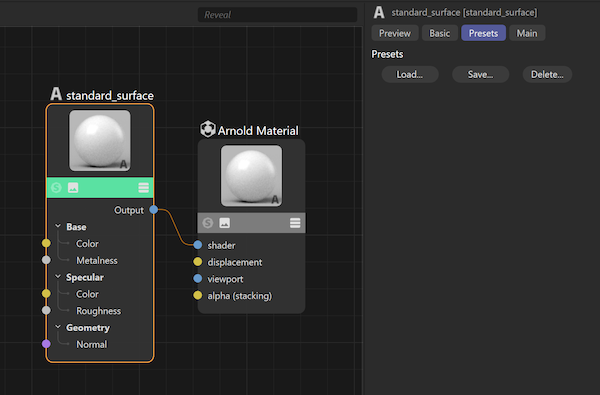 Info: Presets are available only for specific shaders, such as standard_surface, openpbr_surface, standard_hair, standard_volume, toon, car_pain and color_correct. The Presets tab can be added to third-party shaders via the