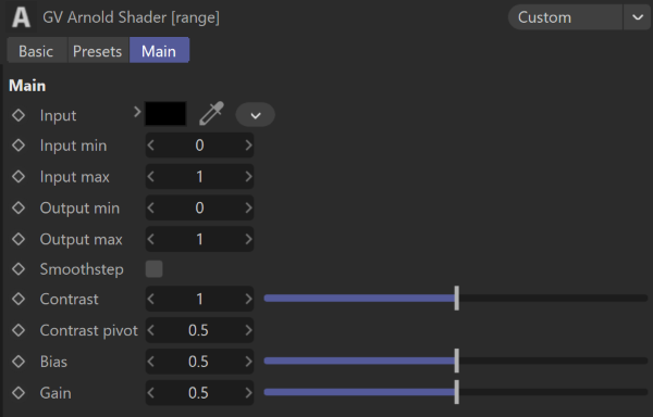 This example adds sliders to the bias, gain and contrast parameters of the range shader and defines a custom vector/color selection widget as the input parameter.