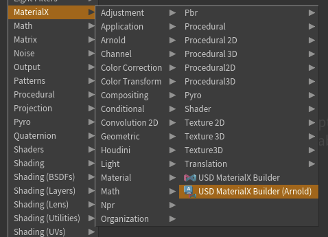 This creates a USD MaterialX Builder with the tab menu mask preconfigured to show Arnold MaterialX VOPs and vanilla MaterialX VOPs: