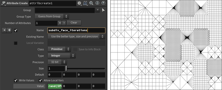 Example showing random values of subdiv_face_iterations in the [0-4] range on the faces of a grid