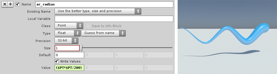 The curve width is overridden using the ar_radius attribute with the value ($PT*$PT)/200