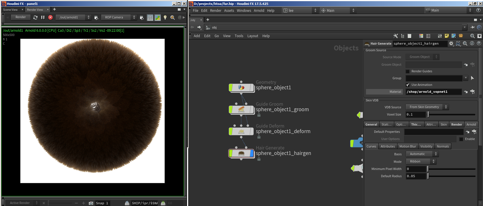 Arnold curve attributesadded to Hair Generate node. standard_hair in Arnold Vopnet -> Material.