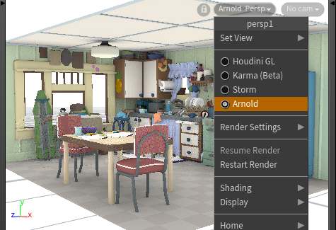 - Select the Persp dropdown menu in the camera viewport and choose Arnold from the Hydra delegate list. You should now see the kitchen USD rendered with Arnold.
