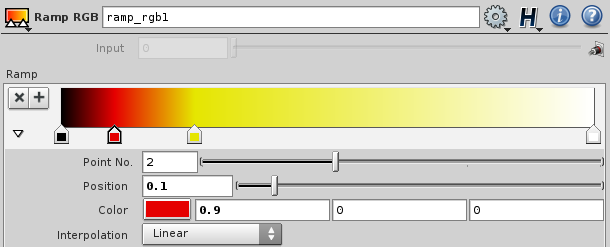 - The information coming from the heat field needs to be colored. Create a ramp_rgb node and connect the Volume OpenVDB to the input. Choose colors like those below to map the range.