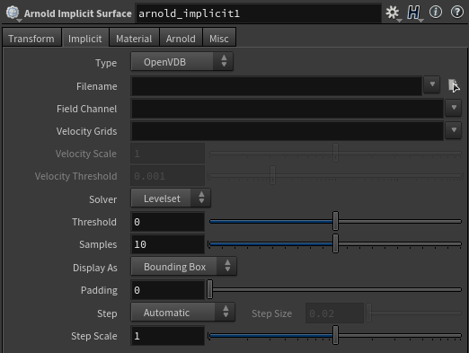 Volume implicit nodes can be used to load volume data from OpenVDB files, or OSL shaders for rendering volumes and implicit surfaces, respectively.