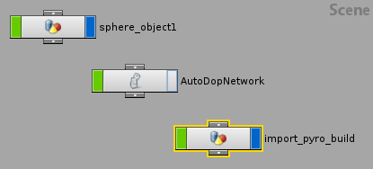 - There will now be three nodes at scene level; the sphere, which has been converted to fuel, the AutoDopNetwork, which contains the simulation and import_pyro_build which visualizes the result in the viewport.