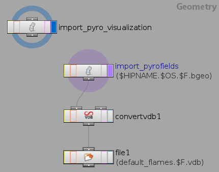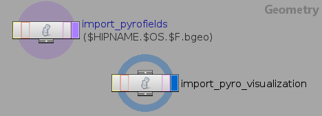 - Inside, there are 2 DOP import nodes, import_pyrofields (purple for rendering) and import_pyro_visualization (blue for viewport display only). Import_pyro_visualization contains the density, heat and temperature grids. Import_pyrofields holds the same grids and the additional fuel and velocity grids. Keep in mind that the more grids are exported the larger the VDB file size will be on disk.